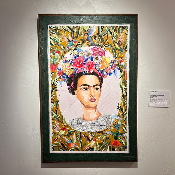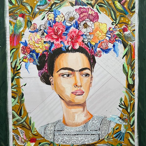 About the Artwork: “Lo que no me mata, me alimenta.” -Frida Kahlo I felt this quote in my soul. I found myself painting a style of Frida that inspired me. That included a crown flowers fit for a queen, hummingbirds that were unstoppable, and new plant life growing all around her.