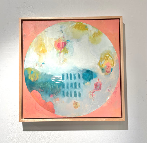 About the Artist: This painting began as a way to explore pairs of contrasting ideas and my place between them: earthly and heavenly, manmade and natural, flawed and perfect. I chose a motif that is commonly used to represent heaven and earth—a circle inscribed in a square—to examine their connection. The composition reminds me of the porthole of a ship, which provides light, air, and views of the outside world to dark quarters below deck. Although this small opening essentially narrows the viewer’s field of vision, allowing only a portion of the landscape to be viewed at a time, these tiny glimpses accumulate and can broaden perspectives over time.