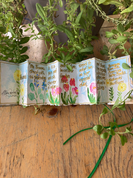 Reciprocal. This is the title of a tiny artist's book constructed of board, Arches 140 lb watercolor paper, and collaged cover papers. The front and back of the text block are painted with gesso, watercolor, and black and gold inks. The cover papers are painted with acrylic paint. The text reads: “Mr. Thoreau dined with us yesterday . . . . He is a keen and delicate observer of nature, ….and Nature, in return for his love, seems to adopt him as her especial child, and shows him secrets which few others are allowed to witness. Passages From The American Note-Books. Nathaniel Hawthorne. P. 318