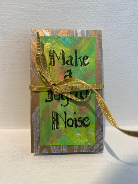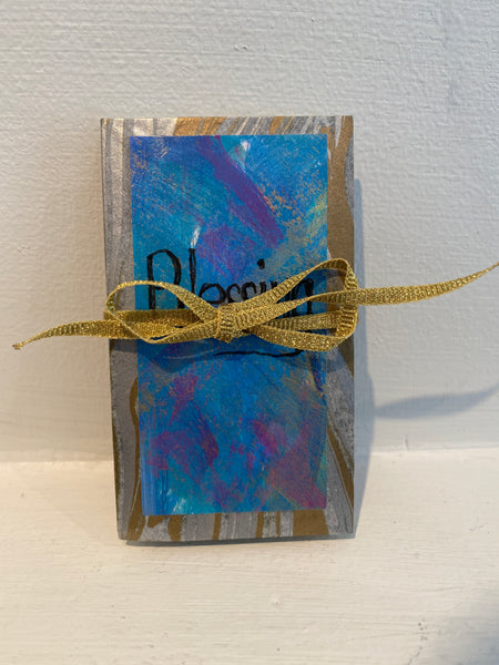 Blessing. This is the title of a tiny artist's book constructed of board, Arches 140 lb watercolor paper, and collaged cover papers. The front and back of the text block are painted with gesso, watercolor, and black and gold inks. The cover papers are painted with acrylic paint. The text reads: The Lord bless thee, and keep thee; The Lord make his face shine upon thee, and be gracious unto thee; The Lord lift up his countenance upon thee, and give thee peace.” Holy Bible Num. 6: 24-26.
