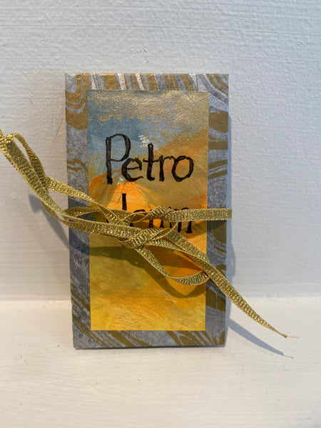 Petroleum. This is the title of a tiny artist's book constructed of board, Arches 140 lb watercolor paper, and collaged cover papers. The front and back of the text block are painted with gesso, watercolor, and black and silver inks. The cover papers are painted with acrylic paint. The text reads: “The Senecas rubbed their skins with it. They may have used it for light and heat. The use of petroleum is old in the world. Workmen laid asphalt three thousand years before Jesus Christ. Annals of the Former World John McPhee. P. 249