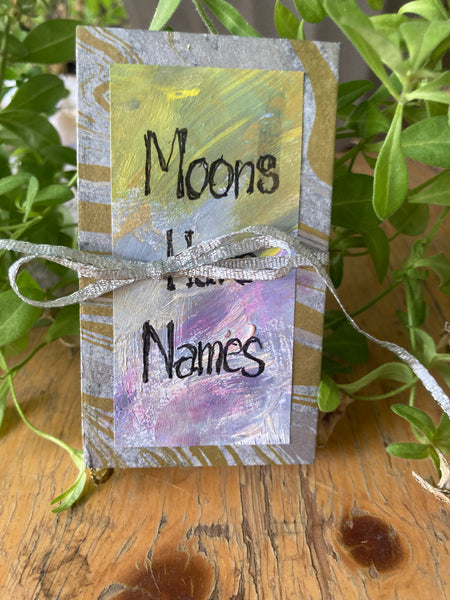 Moons Have Names. This is the title of a tiny artist's book constructed of board, Arches 140 lb watercolor paper, and collaged cover papers. The front and back of the text block are painted with gesso, watercolor, and black and silver inks. The cover papers are painted with acrylic paint. The text reads: January, Wolf Moon May, Flower Moon September, Harvest Moon February, Snow Moon June,Strawberry Moon October, Hunter’s Moon March, Sap Moon July, Buck Moon November, Beaver Moon April, Frog Moon August, Green Corn Moon December, Long Night Moon from When the Moon Is Full by Penny Pollock.