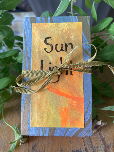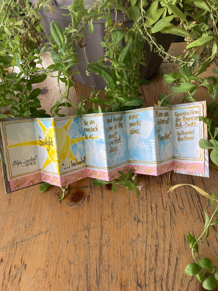 Sunlight. This is the title of a tiny artist's book constructed of board, Arches 140 lb watercolor paper, and collaged cover papers. The front and back of the text block are painted with gesso, watercolor, and black and gold inks. The cover papers are painted with acrylic paint. The text reads: “...behold! The sun came back to us, and brought one of the most perfect days ever made since Adam was driven out of Paradise.” Passages From The American Note-Books. Nathaniel Hawthorne. P. 315