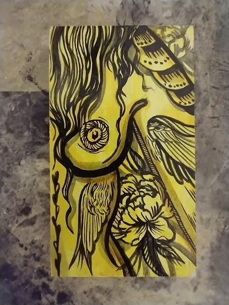 Primarily self-taught artist, ESS22, focuses on painting female figures. Their emotive figurative artwork and illustrative style draws upon more than a few influences, including: German expressionism, an intuitive aesthetic, printmaking, textiles, alternative/punx aesthetic, and tattooing.