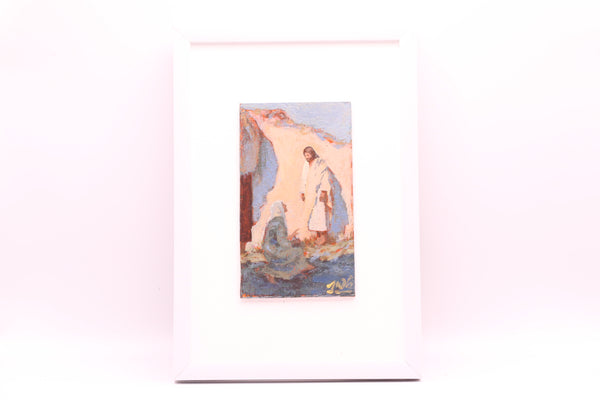 Artist Statement: But Mary stood without at the sepulchre weeping: and as she wept, she stooped down, and looked into the sepulchre…And when she had thus said, she turned herself back, and saw Jesus standing, and knew not that it was Jesus. Jesus saith unto her, “Woman, why weepest thou? whom seekest thou?” She, supposing him to be the gardener, saith unto him, “Sir, if thou have borne him hence, tell me where thou hast laid him, and I will take him away.” Jesus saith unto her, “Mary.” She turned herself, and saith unto him, “Rabboni;” which is to say, Master. Jesus saith unto her, “Touch me not; for I am not yet ascended to my Father: but go to my brethren, and say unto them, I ascend unto my Father, and your Father; and to my God, and your God.” Mary Magdalene came and told the disciples that she had seen the Lord, and that he had spoken these things unto her. (John 20:11, 14–18)