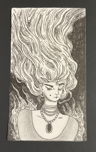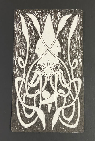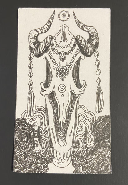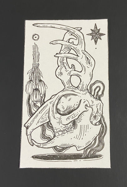 About the Artist: As a lab technician at the University of Utah, I get most of my inspiration from the organic, natural shapes that I see daily beneath the microscope. In my free time, I enjoy creating detailed illustrations with emphasis on shape and composition. My business card series portrays the story of an outcast witch who embarks on a journey to alter their fate. I'm excited to be showing my work at JKR alongside my partner, Olivia Dawson. I post both digital and traditional art irregularly on my instagram -- @j00nip3r