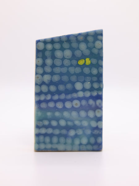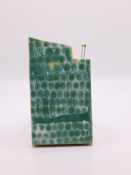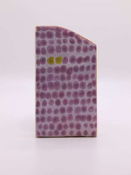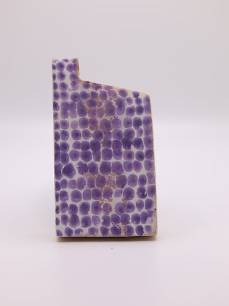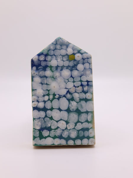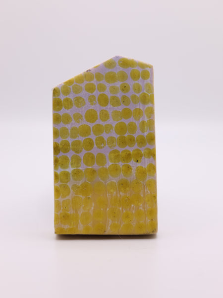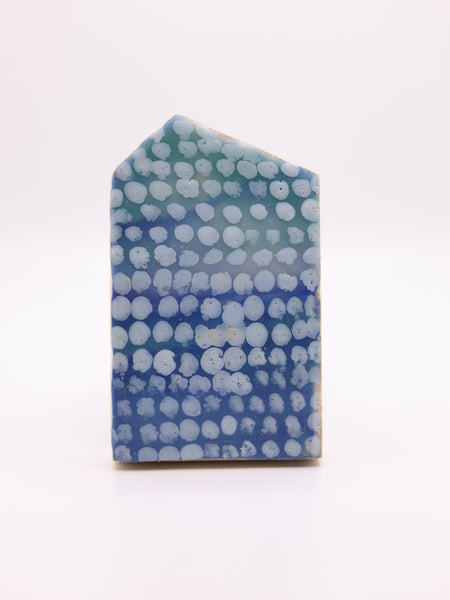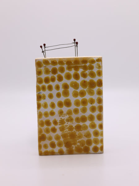 About the Artwork: This series, called Handiwork, takes its titles from terms used in needlecraft and sewing. The foundation is a hand cut form of a house, a shape I began making during the global shelter in place. The repetitive dots go down like stitches, marking time with women creating with their hands across the globe. With the heat of the torch, the marks melt into cell-like shapes, relating to how handiwork is part of our stories and life events - the literal and emotional fabric that is passed down through our lives.