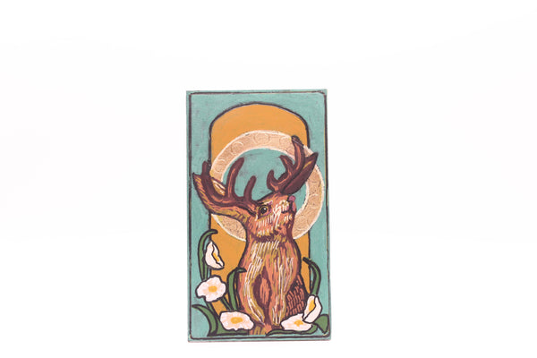 Artist Statement: This piece transforms a folk-tale creature into a powerful symbol, blending the playful nature of the jackalope myth with the serious reverence of a religious icon.