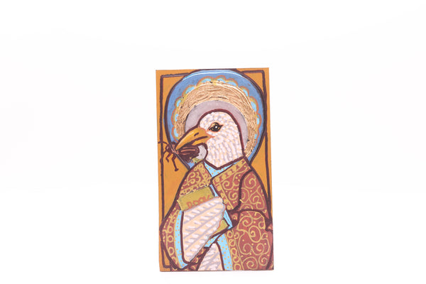 Artist Statement: In this icon, the California gull—the unsung savior of early Mormon pioneers—is canonized in radiant gold, a divine agent bearing the cricket, both pest and providence. Stylized like a Byzantine saint, the gull is not merely a bird, but a vessel of ecological grace, transforming a survival story into a state-sanctioned miracle.