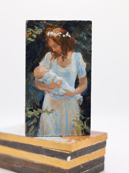 Nurture: A mother stands lovingly cradling her baby. They are out in nature, surrounded by deep greens and blues. In this painting I am referencing nature and nurture, but not as a debate to decide which has more influence. Simply as an acknowledgment that it is wondrous to consider how these tiny humans come with so much in them already, and it is a privilege to encourage them to grow.