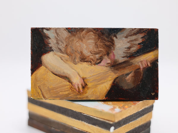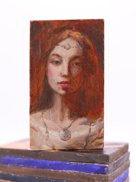Stand Still: We see a woman's profile surrounded by abstract shapes of green, yellow, and red. The yellow form a hint of a halo and her face is serene. For this painting, I was exploring ideas of mindfulness and presence. I came across these lines from the poem "Lost" by David Wagoner that beautifully convey some of what I was hoping to accomplish with this tiny painting. "Stand still. The trees and bushes beside you are not lost. Wherever you are is called Here. And you must treat it as a powerful stranger, Must ask permission to know it and be known."