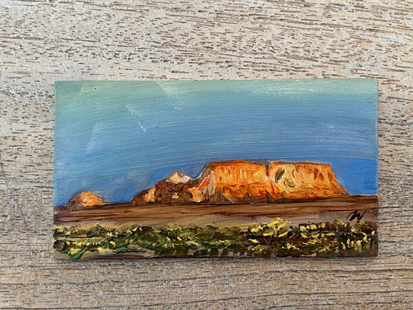 Lechee Rock (Oil on gesso board) - Every day this mesa stood as a sentinel over my homeland. I saw it everyday and took it's beauty for granted. At sunset is when its glory shone.