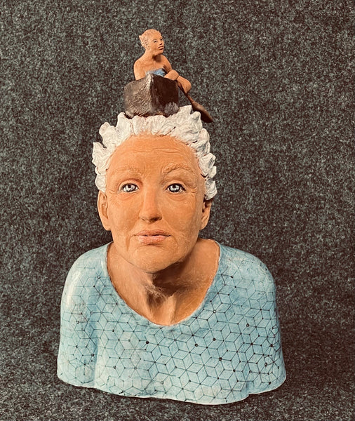 Artist Statement: I have weathered many a storm on my journey. Currently, I am navigating aging. Things get harder, including making sculptures. The title is inspired by Mary Pipher's book, Women Rowing North: Navigating Life's Currents as We Age.