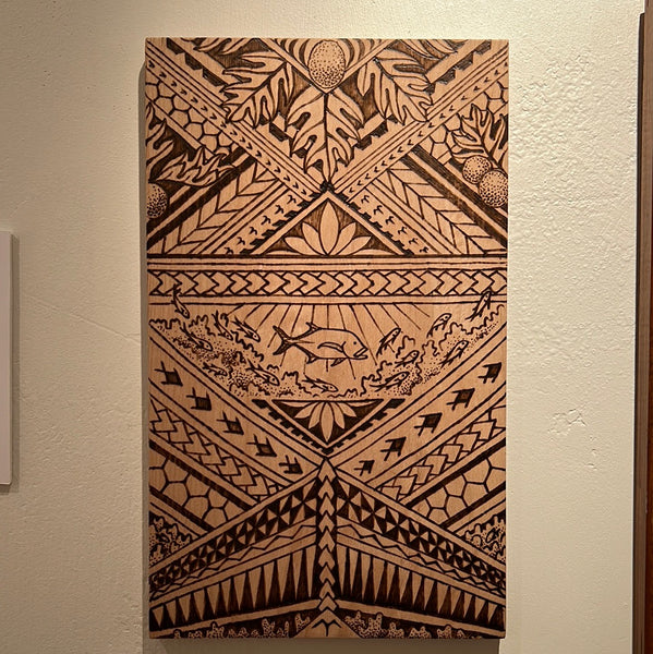 About the Artwork: This piece was hand burned onto wood and features Samoan tattoo designs, Ulu leaves and fruit, and an Ulua over a reef. Ulu, or breadfruit, is a tree spread throughout the Pacific Islands by early Polynesians because of its importance as a traditional food source. Ulua, or Giant Trevally, are large fish found on reefs throughout the Pacific where they are prized for both food and game. Both Ulu and Ulua are symbols of my heritage. For me the Ulu is feminine. It represents my sisters, my mother, my grandmother. It is a symbol of my Polynesian ancestry and the strength of family. The Ulua is masculine. It is my brother, father, uncles and grandfather, the people who taught me to love and respect the sea; it is protection and guidance.